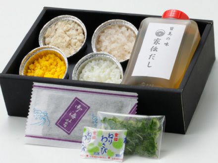 そぼろにした鯛の身、茹でた卵の黄身と白身を裏ごししたもの、大根おろし・ねぎ・わさび・のりをご飯の上に乗せて、出汁をかけて食べる「皆美館」に代々伝承されている家伝料理です。
